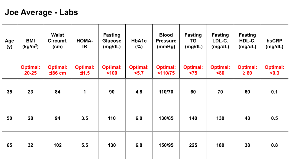我将通过观察普通人从 35 岁到 50 岁再到 65 岁的变化来说明胰岛素抵抗综合征的出现。将观察体检化验结果,考虑体内发生了什么变化,而这些变化往往会导致几乎所有成年人在衰老过程中都发生非常相似的变化。