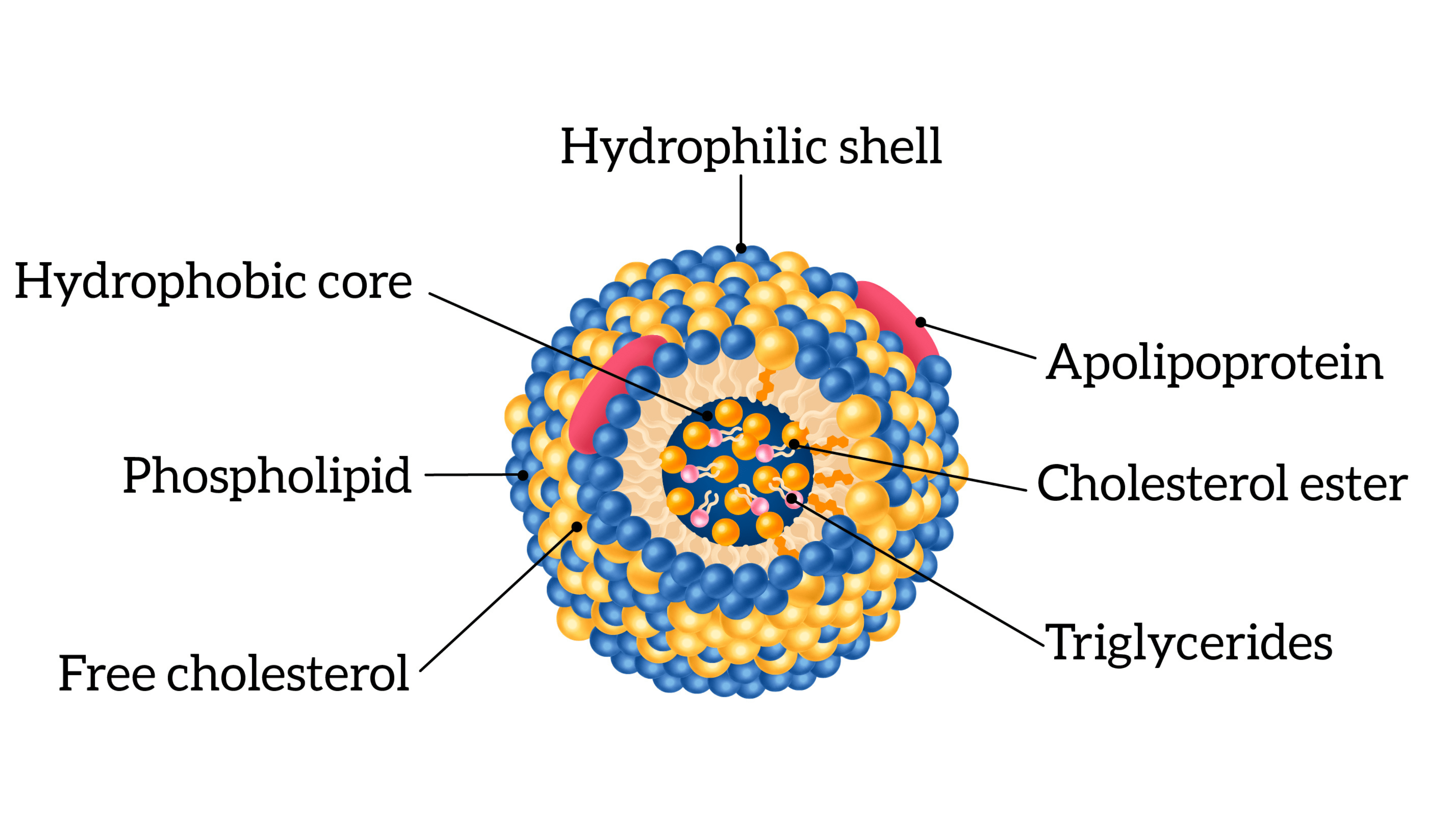 上图显示了脂蛋白颗粒的一般结构。脂蛋白在颗粒中心含有不与水混合的脂肪,例如甘油三酯了,是携带的货物。在外面,有一些与水更相容的分子,例如胆固醇和某些蛋白质。与脂蛋白颗粒相关的蛋白质称为载脂蛋白。
