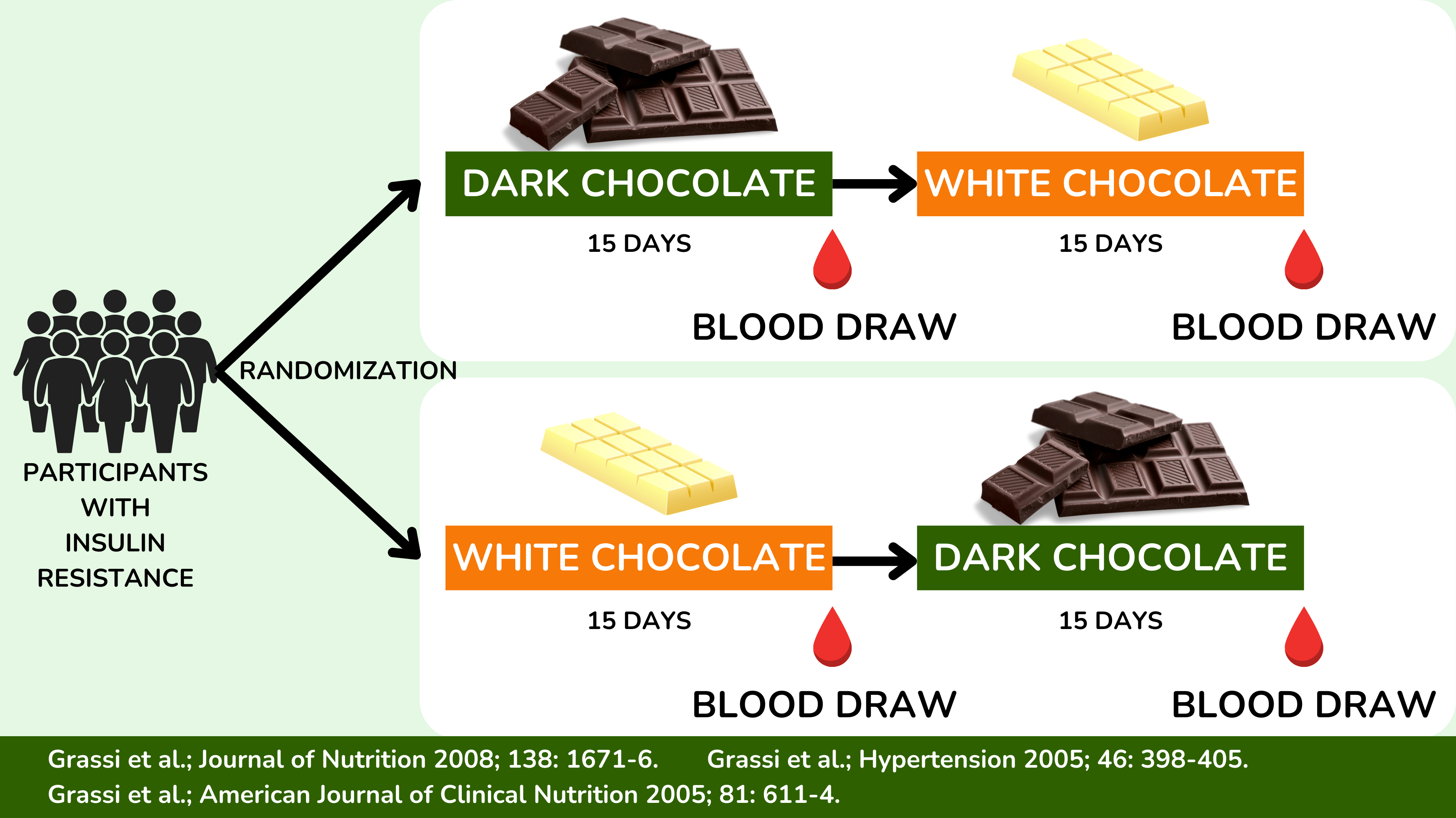 在这三项研究中(Grassi 等人;高血压 2005Grassi 等人;美国临床营养杂志 2005Grassi 等人;营养杂志 2008),胰岛素抵抗患者被随机分为两组。第一组首先在正常饮食的同时,每天食用一块黑巧克力,连续 15 天。经过一段短暂的洗脱期,这期间不食用任何巧克力,然后食用一块热量相同的白巧克力,连续 15 天。在每个阶段结束时空腹血液测量胰岛素抵抗(见上图)。第二组也完成了两个阶段,但顺序相反,称之为随机对照交叉设计,这是一个特别强大的研究设计,因为可以比较每个人在一种饮食下的胰岛素抵抗与另一种饮食下的胰岛素抵抗。由于人们是随机分组的,可以确保每个人在黑巧克力阶段都食用了黑巧克力,而不仅仅是那些拥有健康生活方式的人,就像上面讨论的观察性研究中的情况一样。