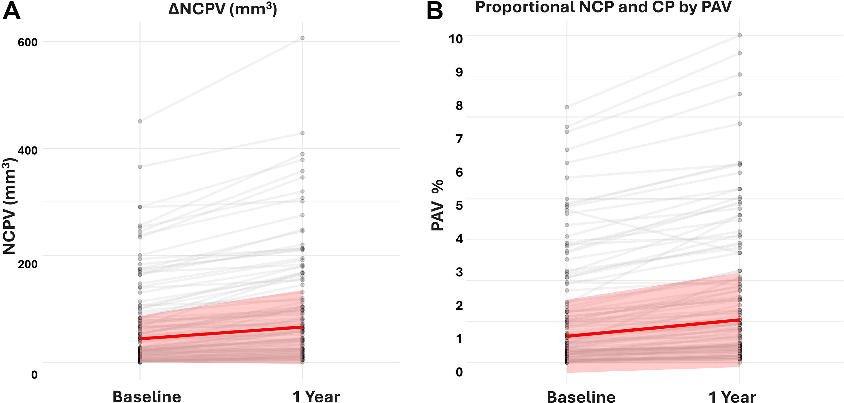 • 在高风险亚组中(基线 CAC > 100 或 10 年 CVD 风险 > 5%),进展进一步加速,达到每年 1.4% 至 2.4%