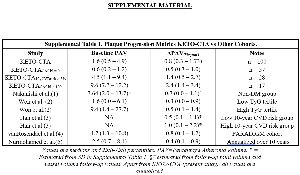 为了更清楚地说明这一点,在Nakanishi 等人的研究中,尽管只有 13% 的参与者的 CAC 评分为零,而 69% 的参与者的 CAC 评分超过 100,但平均 PAV 增幅为 0.7%。这 0.7% 的增幅比 Keto-CTA 研究中 CAC >100 的 LMHR 所经历的增幅 (2.4%) 低三倍多。