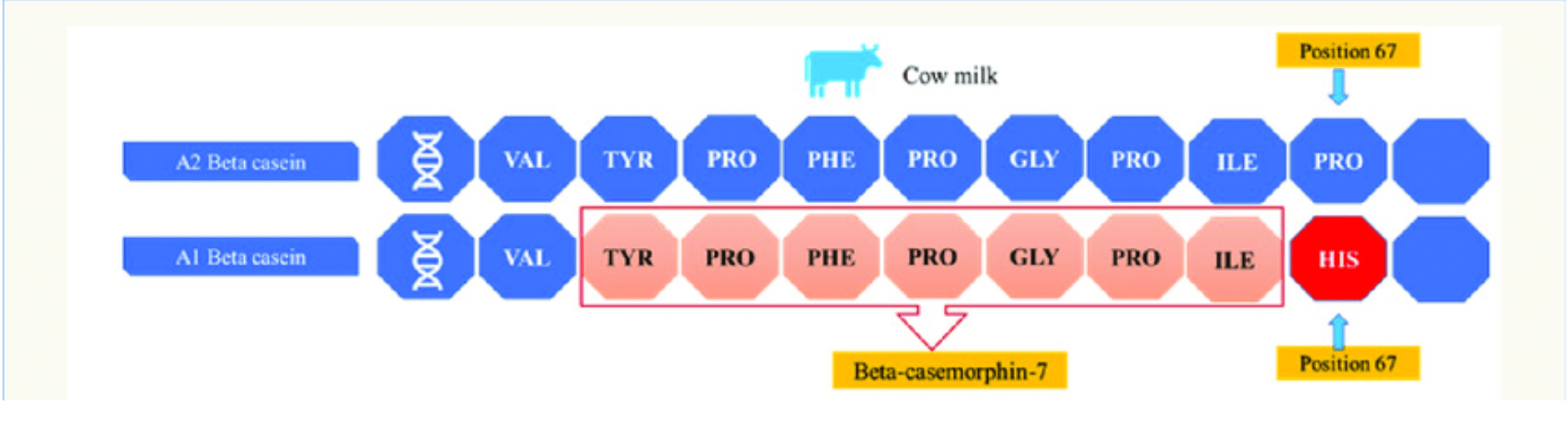 奶牛的基因决定了酪蛋白类型:A2/A2(纯合)奶牛的牛奶不释放β-酪啡肽7;A1/A2(杂合)释放少量;A1/A1(纯合)释放较多。这与A1变体在第67位有组氨酸、A2有脯氨酸有关。