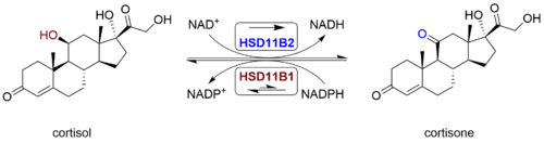 皮质醇是一种活性激素,由可的松通过酶 11β 羟基类固醇脱氢酶 (11β-HSD1) 使用 NADPH 产生。将皮质醇转化回可的松的 11β-HSD2 需要 NAD。