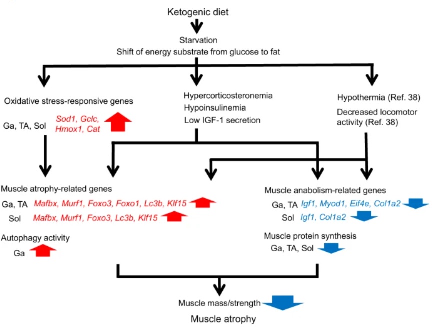 这项动物研究表明,在生酮饮食喂养的小鼠的骨骼肌中肌肉萎缩相关基因 Mafbx、Murf1、Foxo3、Lc3b 和 Klf15 上调。根据 Igf1 等合成代谢基因的表达降低,对快肌 Ga、TA 和 Sol 肌肉的表面翻译感知 (SUnSET) 分析显示 KD 抑制肌肉蛋白质合成……除了高皮质酮血症、低胰岛素血症和 IGF- 1,氧化应激也可能参与 KD 诱导的肌肉萎缩。” ( R )