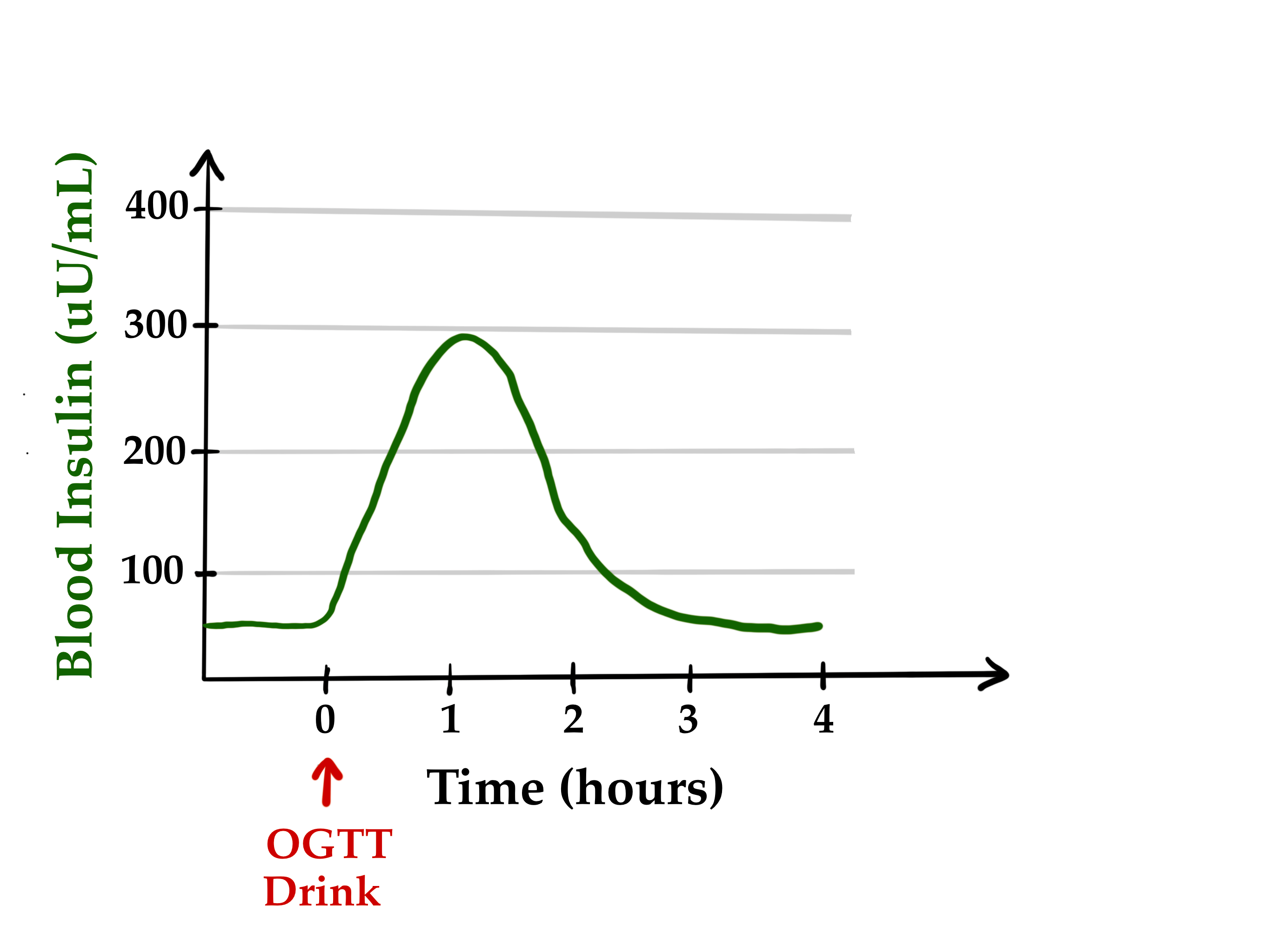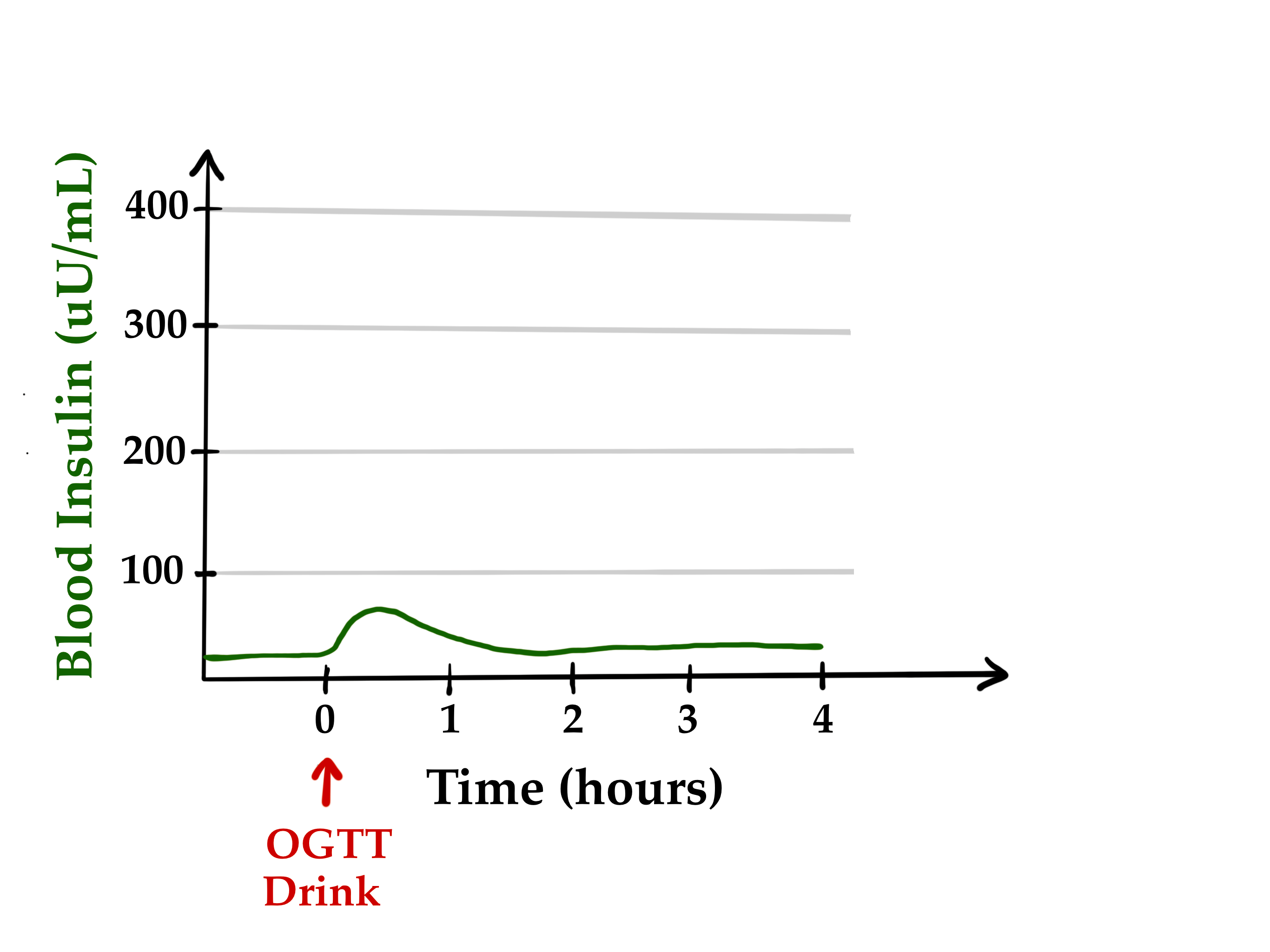 现在,假设一男子进行OGTT检测 ,饮用了含有 15 茶匙葡萄糖的饮料。血糖水平会上升多少?如果他健康的话,可能会达到 160 mg/dL。这相当于他全部血液中的 9.6 克糖。因此,在空腹状态下,他所有的血液中只含有大约一茶匙的糖,即使他吞下含有15茶匙葡萄糖,他所有血液中的葡萄糖含量一次也不会超过2茶匙。这是因为身体很快就能感觉到葡萄糖的进入,事实上,当葡萄糖进入口腔时,身体就已经感觉到了,并确保准备吸收所有膳食葡萄糖,身体已准备好从血液中吸收葡萄糖。这是一个很好的例子,说明健康的身体是多么神奇。如果这样想的话,即使对于糖尿病患者,这个过程仍然非常有效。