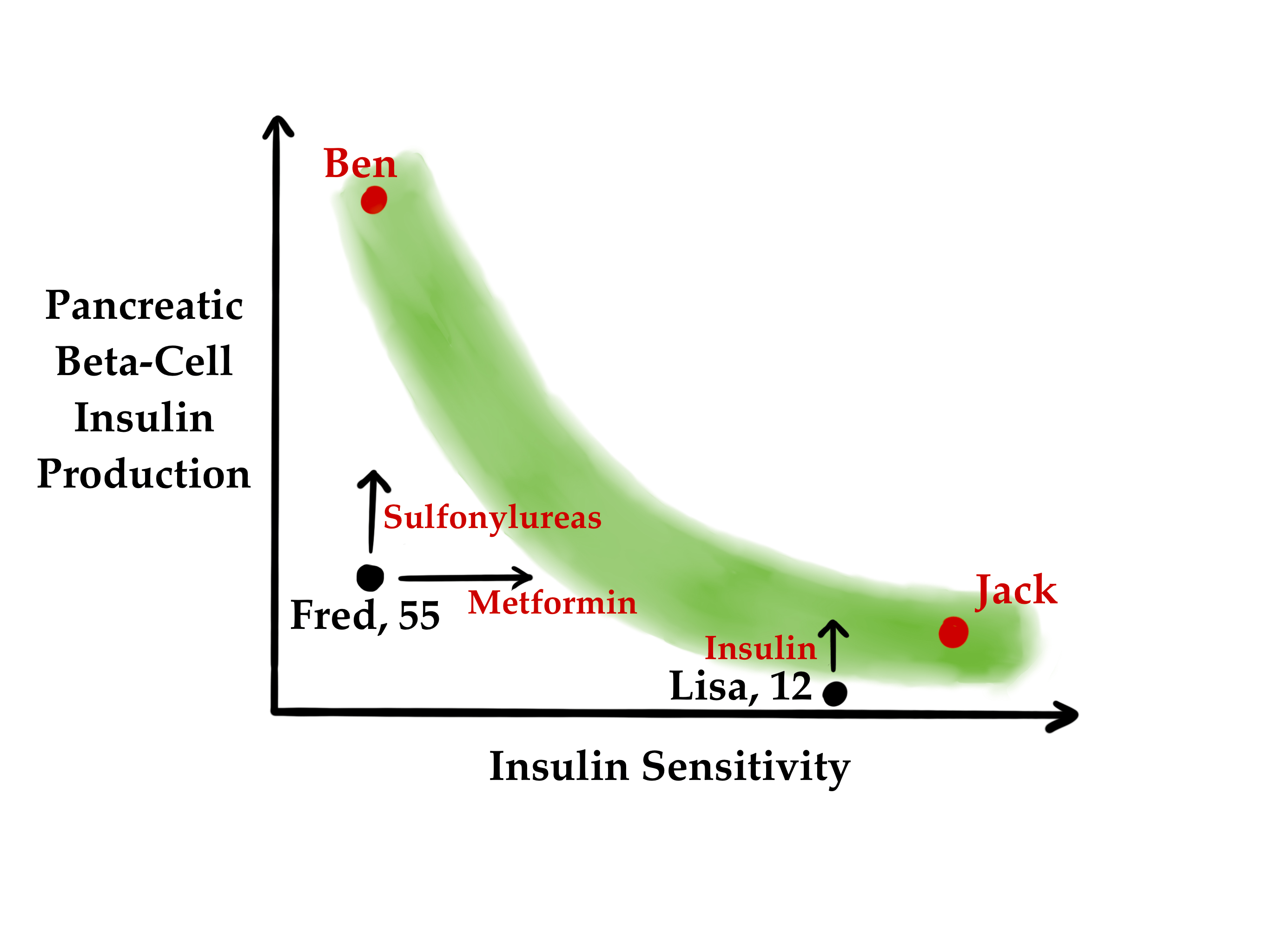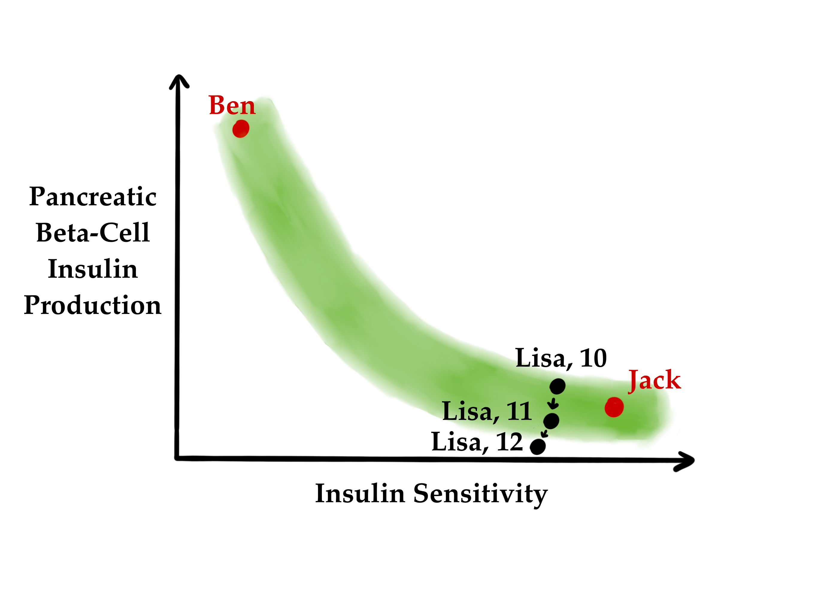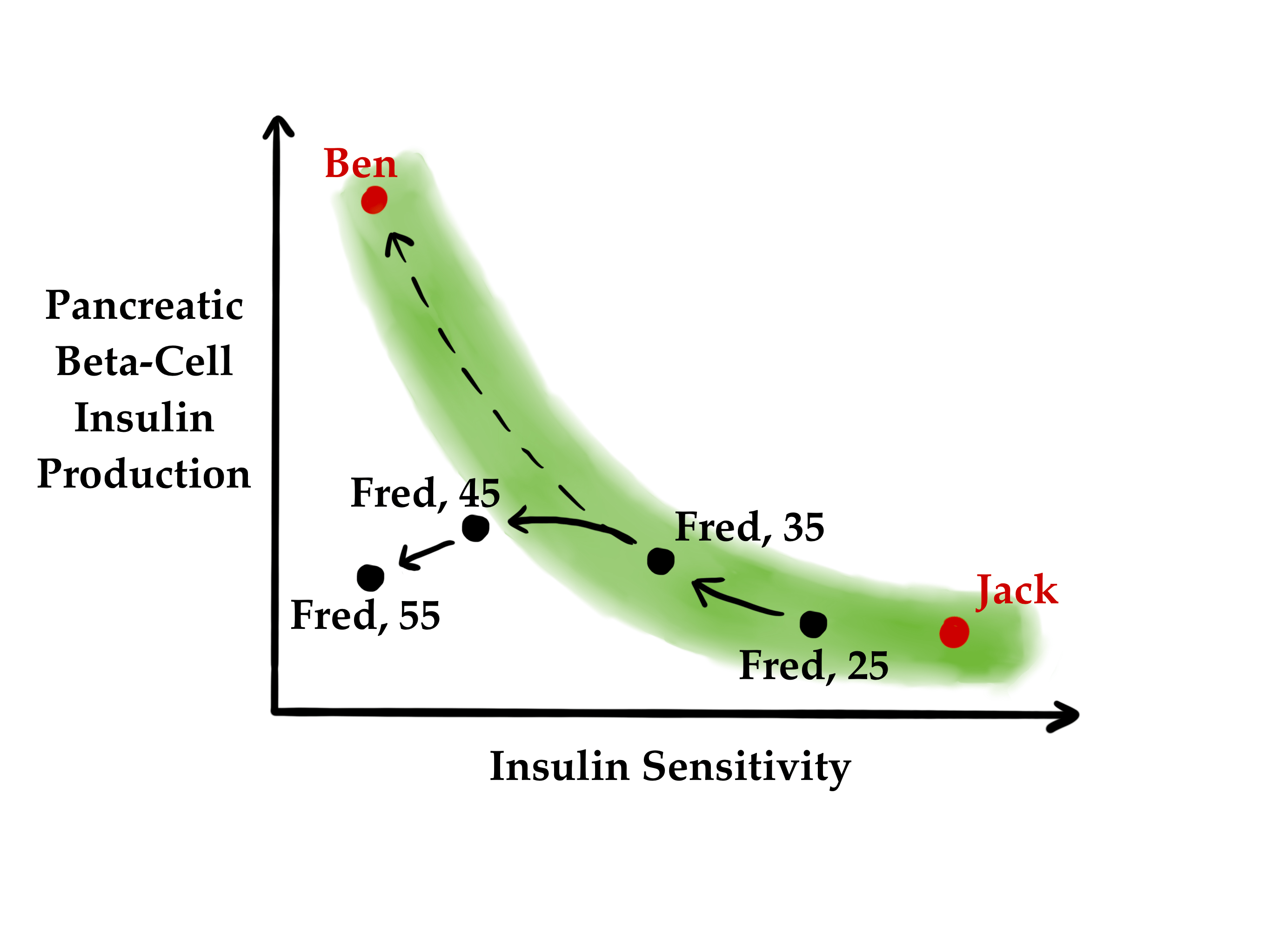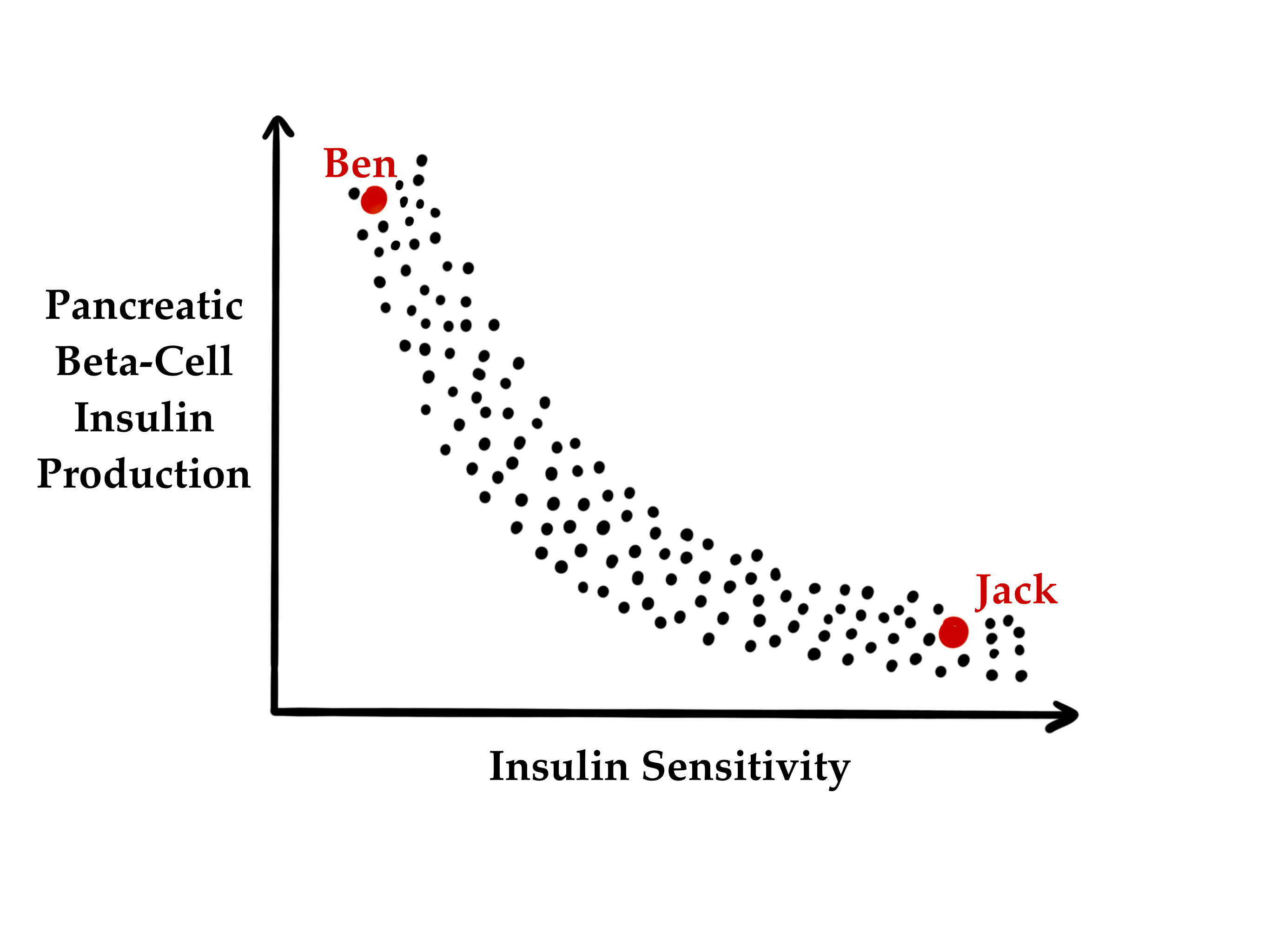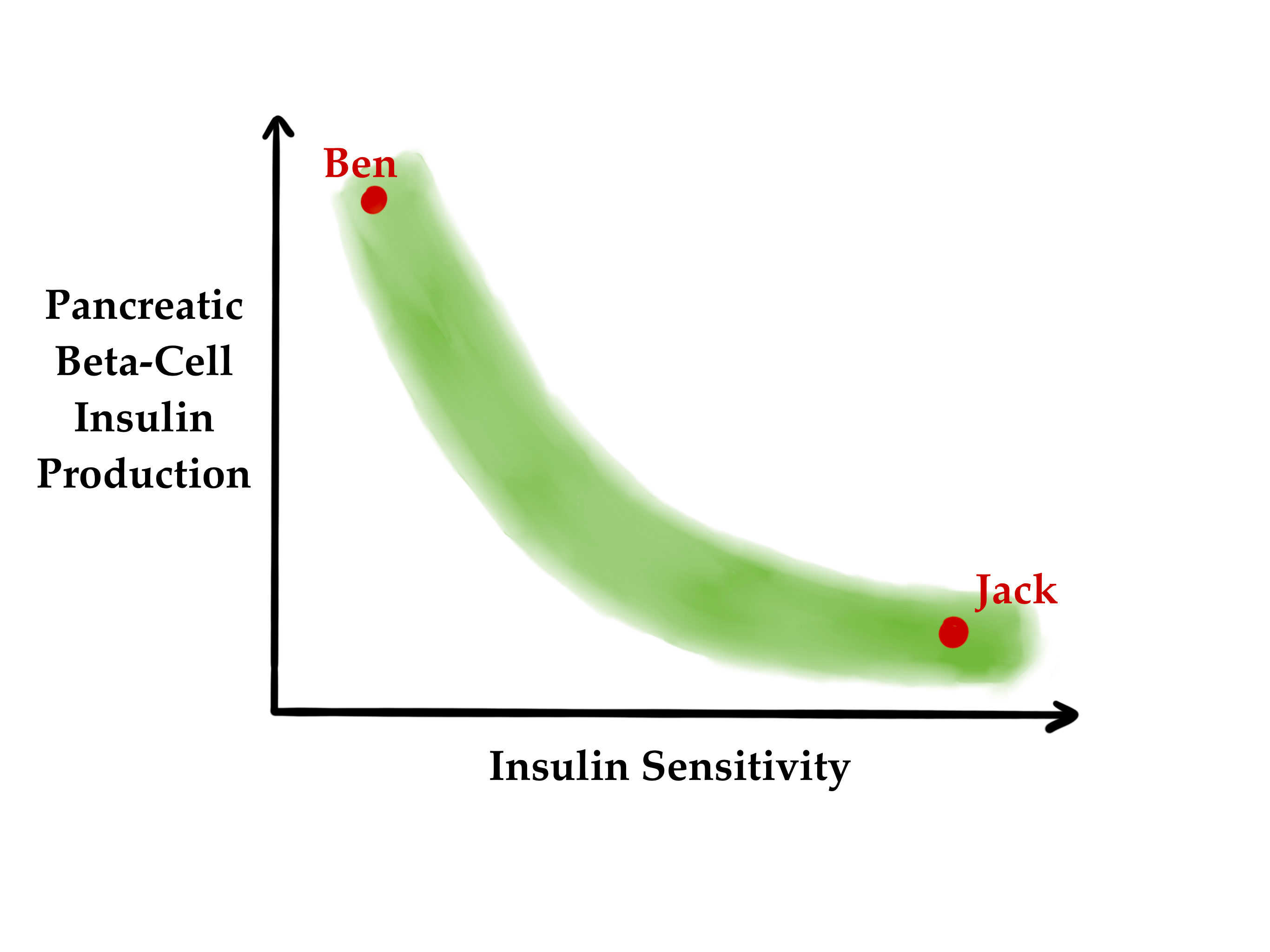作为对技术细节感兴趣的人的旁注,x 轴上的胰岛素敏感和对葡萄糖的急性胰岛素反应的乘积,这是 β 细胞胰岛素产生的衡量标准,显示在 y 轴上,通常称为处置指数。因此,本Ben和杰克虽然在胰岛素敏感上有很大差异,但可能具有相似的处置指数,因此具有相似的葡萄糖耐量。