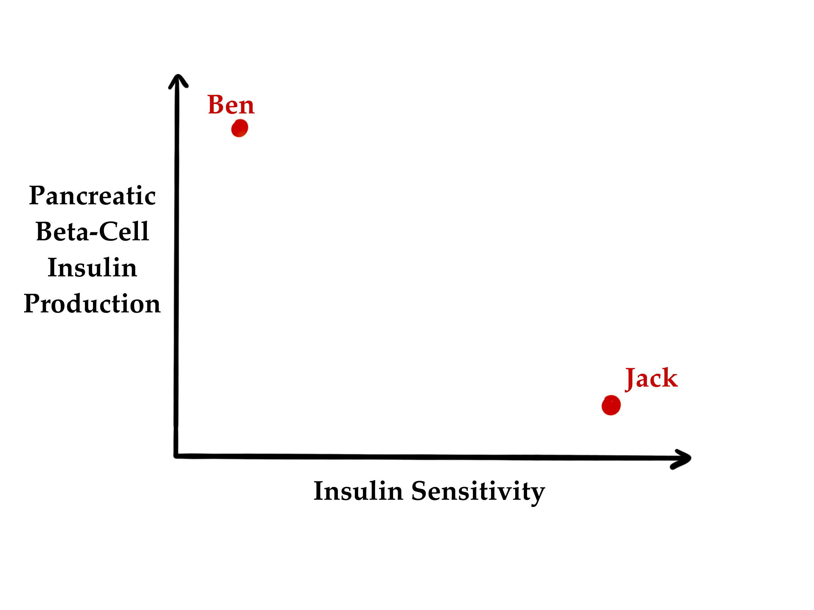 如果我们想象杰克和本Ben对胰腺β细胞产生的胰岛素的敏感性,他们会相差相当远。杰克的胰岛素敏感非常高,因此他的β细胞不需要产生大量胰岛素。本Ben的胰岛素抵抗更强,因此他的 β 细胞需要产生大量胰岛素。请记住,尽管存在这些巨大差异,两人都具有完全的葡萄糖耐量。