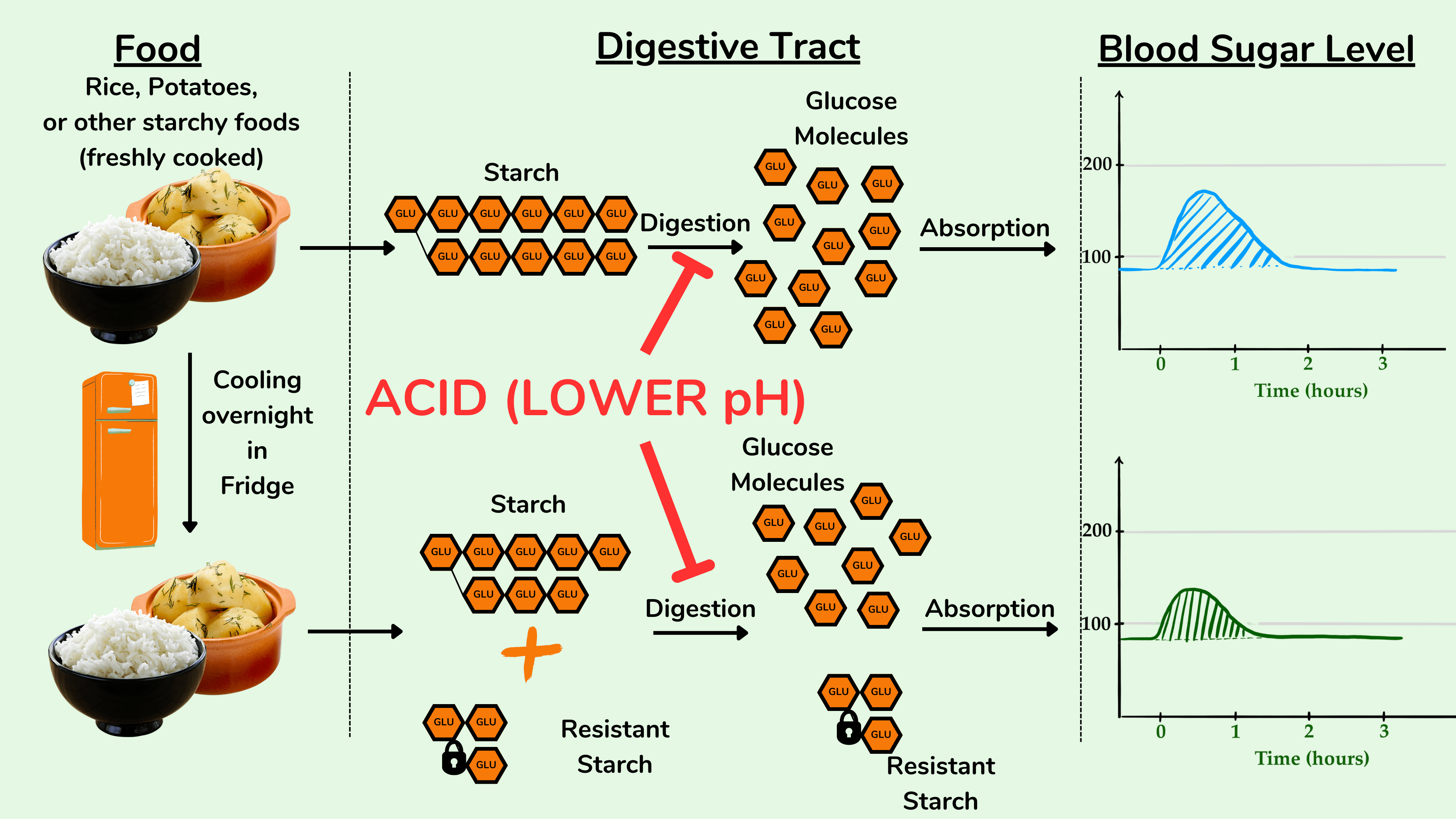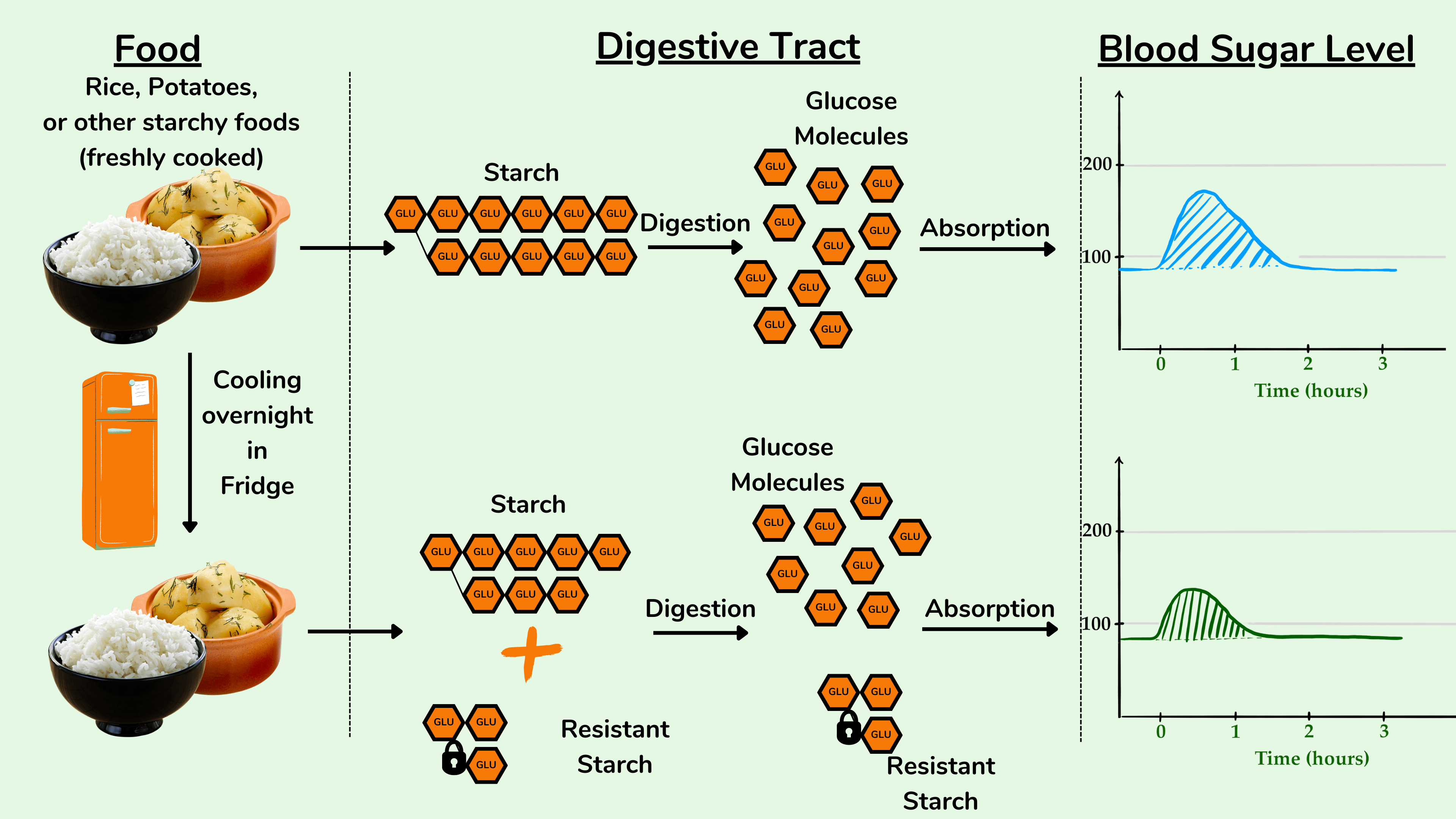 很多人都想知道这一点,很抱歉没有解释这一方面。回顾一下,煮米饭或土豆等淀粉类食物,立即食用时,几乎所有的淀粉都可以很容易地被消化成单个葡萄糖分子。这些小葡萄糖分子很容易被吸收,血糖水平很快就会上升。然而,如果先将食物冷却,最好是在冰箱中冷藏,一些淀粉会转化为抗性淀粉。身体无法消化抗性淀粉,因此进入血液的葡萄糖量会较低。这意味血糖对经过一轮烹饪+冷却的淀粉类食物的反应会降低。