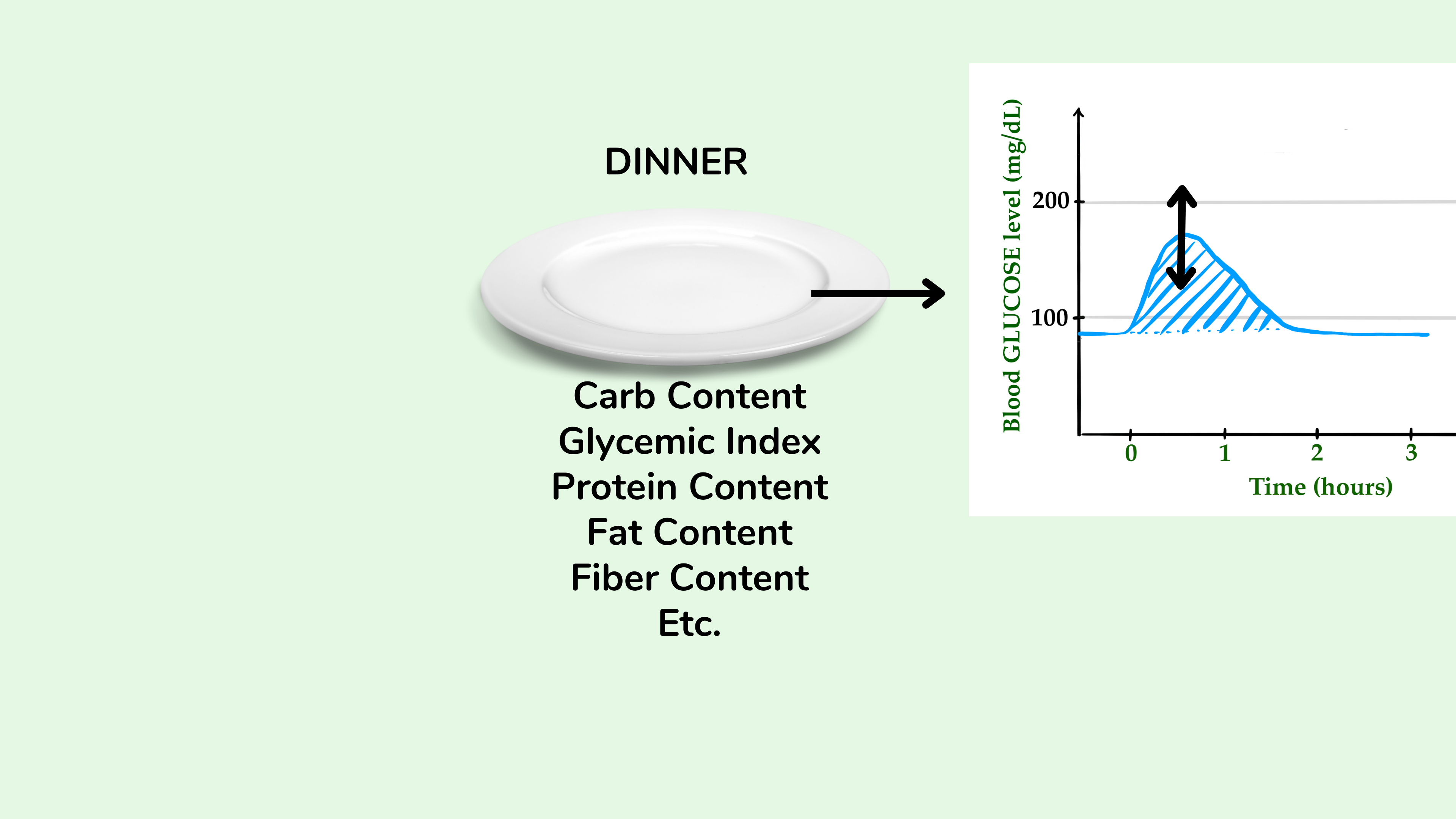对膳食(在本例中为晚餐)的血糖反应主要取决于该膳食的成分。对膳食(在本例中为晚餐)的血糖反应主要取决于该膳食的成分。