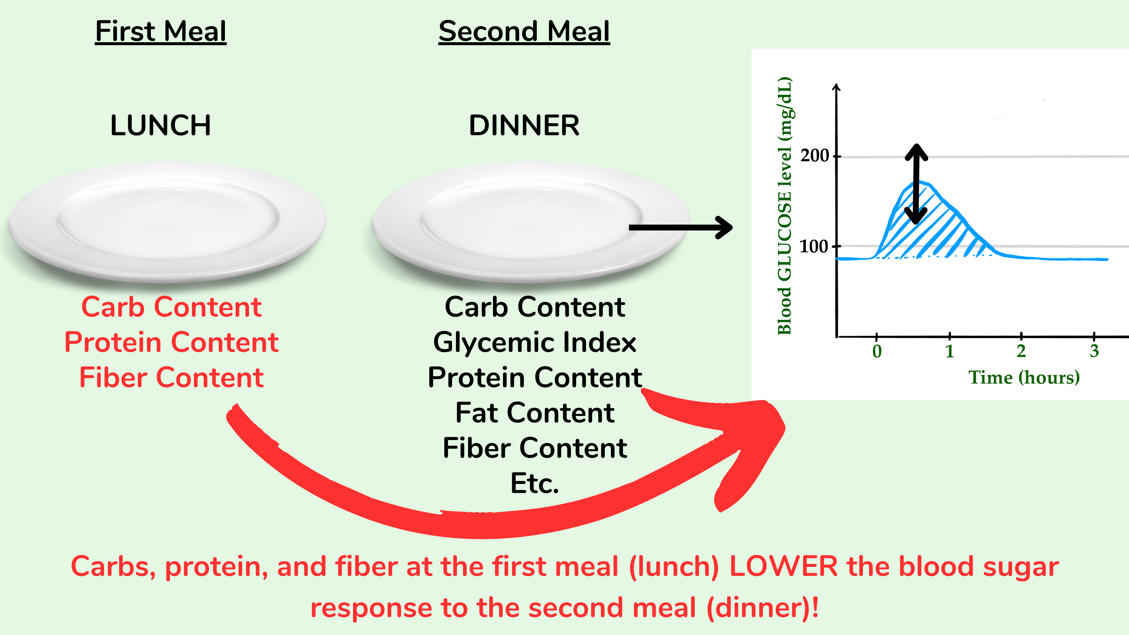 因此,在其他条件相同的情况下,第一餐(在本例中为午餐)中摄入的碳水化合物、蛋白质和纤维会降低对第二餐(在本例中为晚餐)的血糖反应。因此,理想情况下,如果先知道晚餐将摄入大量碳水化合物,那么确保午餐也至少摄入一些碳水化合物,最好还有一些蛋白质和纤维。